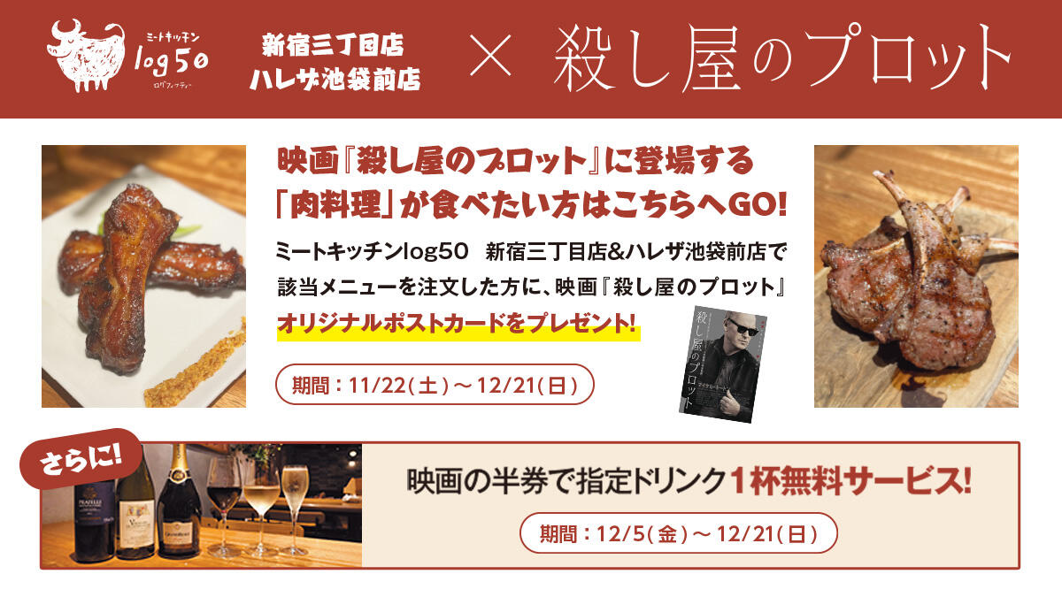 この度、12月5日(金)公開の映画【殺し屋のプロット】とミートキッチンlog50のコラボ記念キャンペーンを開始することといたしましたのでお知らせします。